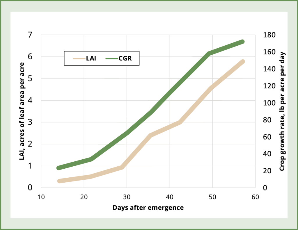 The amount and distribution of leaf area together make up the canopy, and canopy cover increases as leaf area increases. Leaf area is measured as the leaf area index (LAI) or the acres of leaf area per acre of crop. Because leaves aren’t uniformly distributed, and because some light passes through a leaf without being intercepted, LAI may need to reach 5 or 6 before the crop intercepts nearly all of the sunlight. Light interception, canopy photosynthesis, and crop growth rates increase as the canopy develops, with light interception increasing from less than 1% of the amount of sunlight that falls on an acre as plants emerge, to nearly 100% during pod filling. An early start and rapid pace of canopy development means more rapid increases in crop growth rate (Figure 1), which sets the stage for higher yields.