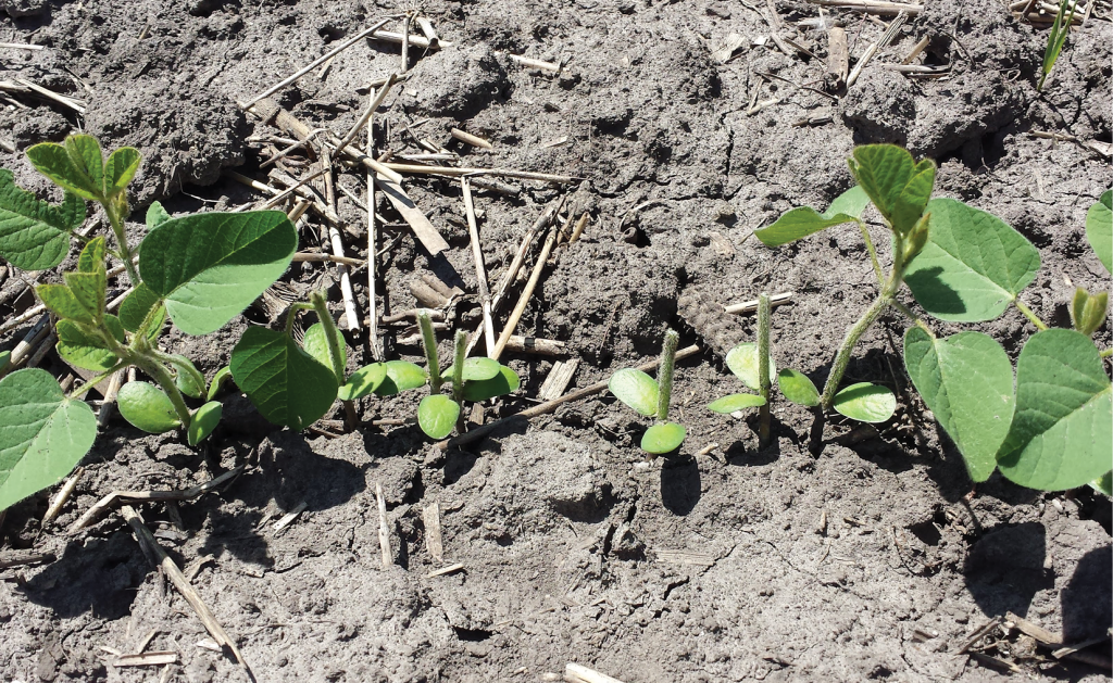 Heavy rains after planting followed by rapid drying (warm, windy weather with a lot of sunshine) can result in soil crusting, especially in some tilled, heavier-textured soils with lower organic matter. Under such a crust, germinating seedlings often lack the energy needed to pull their cotyledons through the soil to emerge. If the crust persists, seedlings will eventually die. The result can be an uneven and lower plant stand.