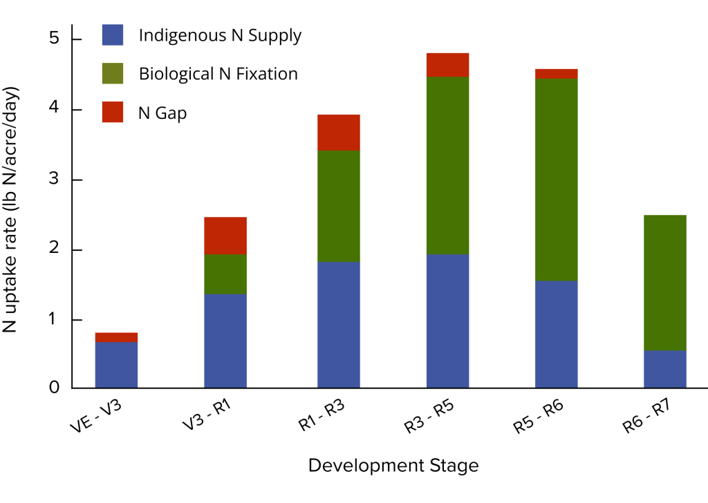 The N shortage occurs mainly before the seed-filling period (R5), with the largest N gap around flowering (R1). Soil N accounts for most of the N supply until flowering because that’s when the root nodules are being developed and are therefore not fixing much N. The indigenous N supply sometimes gets depleted while biological N fixation is unable to contribute to total N needs. However, some strictly no-till systems can benefit from 30 lb N before planting.²