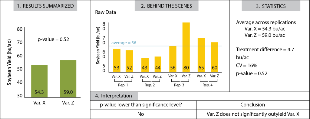 Fert. X outyielded the Control by 3.5 bu/ac, and this difference was significant (at a significance level of 0.05), indicating that the yield gain was likely due to between-treatment variability (e.g. application of fertilizer).